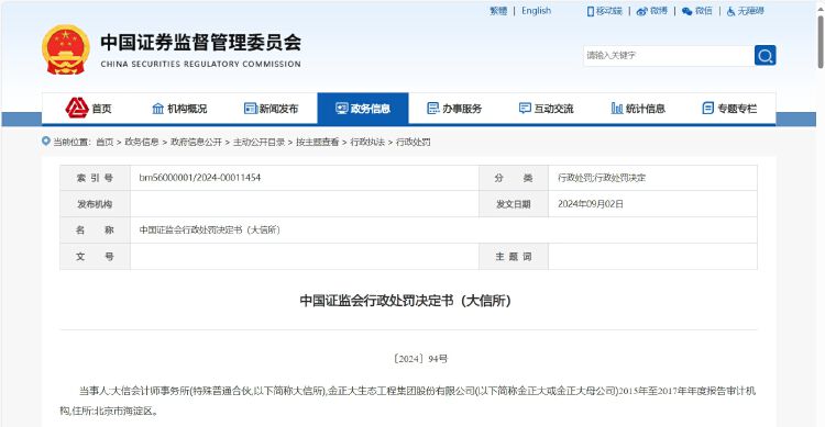 日前,证监会公布行政处罚决定书,大信会计师事务所(特殊普通合伙,以下简称“大信所”)应对金正大2015年至2017年年报审计未勤勉尽责,被没收业务收入201.89万元,并处以403.77万元???。同时,证监会对金正大2015年至2017年年度报告审计签字注册会计师吴某锋、高某涛给予警告,并分别处以5万元??睢?
