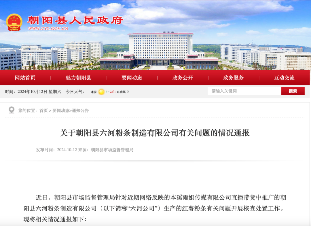近日,辽宁朝阳市朝阳县市场监督管理局针对近期网络反映的本溪雨姐传媒有限公司直播带货中推广的朝阳县六河粉条制造有限公司(以下简称“六河公司”)生产的红薯粉条有关问题开展核查处置工作。现将相关情况通报如下: