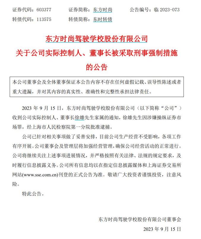 9月15日,东方时尚驾驶学校股份有限公司公告称,收到公司实际控制人、董事长徐雄家属的通知,徐雄因涉嫌操纵证券市场罪,经上海市人民检察院第一分院批准逮捕。