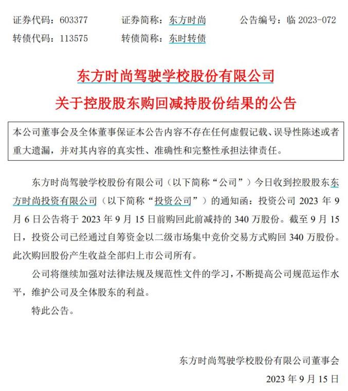 9月6日,东方时尚发布公告称,东方时尚投资将通过自筹资金于9月15日前购回340万股减持股份,如此部分股份购回涉及收益所得将全部归上市公司所有。
