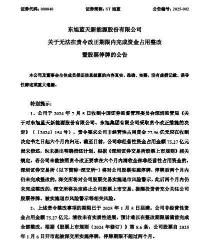 1月5日,东旭蓝天新能源股份有限公司(简称“ST旭蓝”或“公司”)发布关于无法在责令改正期限内完成资金占用整改暨股票停牌的公告。公告透露,截至目前,公司非经营性资金占用金额75.27亿元尚未偿还,也未提出明确偿还计划。根据《深圳证券交易所股票上市规则》相关规定,若公司未能按照责令改正要求在六个月内清收全部非经营性占用资金的,深圳证券交易所(以下简称“深交所”)将对公司股票实施停牌,停牌后两个月内仍未完成整改的,深交所将对公司股票交易实施退市风险警示,此后两个月内仍未完成整改的,深交所将决定终止公司股票上市交易。公司股票自2025年1月6日开市起停牌。