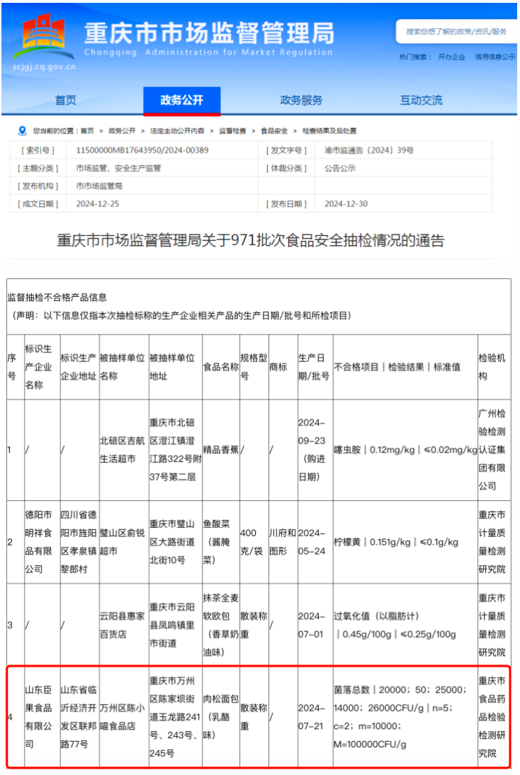 近日,重庆市市场监督管理局发布了一份关于971批次食品安全抽检情况的通告(渝市监通告〔2024〕39号),引发了广泛关注。该局近期对饼干、餐饮食品、茶叶及相关制品、炒货食品及坚果制品等27类食品进行了抽检,共涉及971批次样品。经过严格的抽样检验,结果显示合格样品为965批次,而不合格样品达到了6批次。其中,万州区陈小喵食品店销售的、标称山东臣果食品有限公司生产的肉松面包(乳酪味)因菌落总数超标而被列为不合格产品之一。
