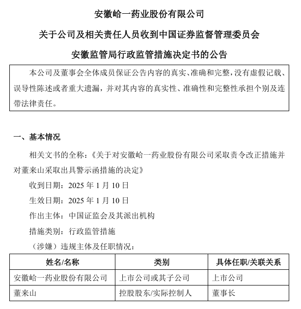 1月13日,安徽峆一药业股份有限公司1月13日晚公告,公司10日收到安徽证监局下发的《关于对安徽峆一药业股份有限公司采取责令改正措施并对董来山采取出具警示函措施的决定》。