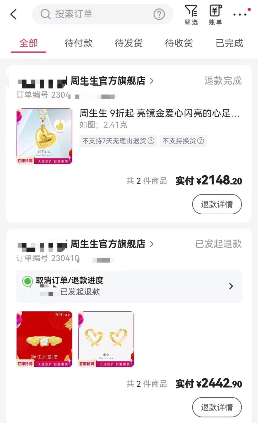 北京消费者李女士告诉记者:“我看到周生生旗舰店有促销活动,就购买了4单手链、项链等足金首饰。商家没有电话联系我,也没协商给予任何补偿就取消了交易。”