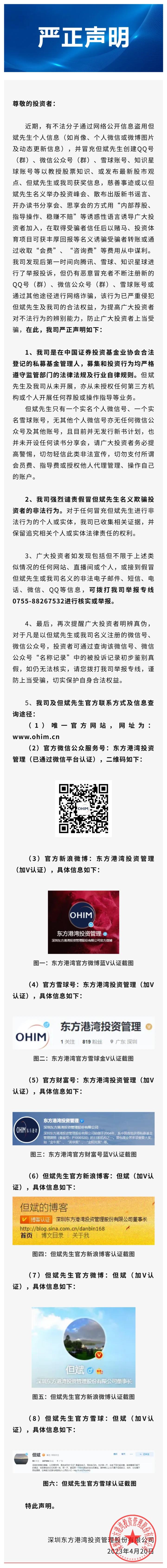 6月27日,东方港湾投资管理官微发布关于警惕冒充但斌进行不法活动的严正声明。声明称,公司强烈谴责假冒但斌名义欺骗投资者的非法行为。对于任何冒充但斌进行非法行为的个人或实体,公司已收集相关证据,并保留追究相关个人或实体法律责任的权利。