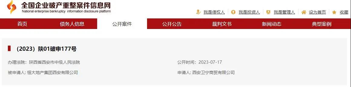 全国企业破产重整案件信息网显示,恒大地产集团西安有限公司被西安卫宁商贸有限公司申请破产,办理法院为陕西省西安市中级人民法院,公开时间为7月17日。
