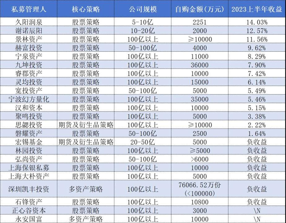 表格:2022年宣布自购的23家私募今年上半年的业绩表现情况