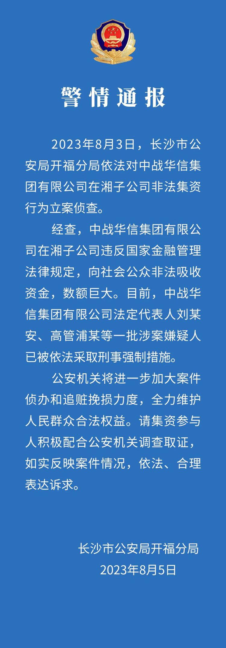 5日,长沙市公安局开福分局还发布了《“中战华信”涉嫌非法集资案集资参与人信息登记公告》,内容如下: