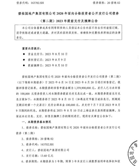 8月7日,碧桂园控制的碧桂园地产集团有限公司发布公告,提前兑付“20碧地02”未回售债券的本息。该债券发行金额13.6亿元,票面利率4.19%,为5年期,附第3年末发行人调整票面利率选择权和投资者回售选择权。