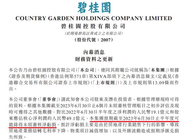 7月31日,碧桂园发布公告称,根据管理层现时可得的资料,以及碧桂园集团截至2023年6月30日止6个月未经审核管理账目之初步评估及现时可获得之其他数据,对比2022年6月30日半年度之净利润约19.1亿元(人民币,下同)和股东应占核心净利润约49.1亿元,预期截至2023年6月30日止半年度可能录得未经审核净亏损。
