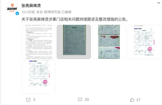 媒体介入后没过多久,张亮麻辣烫马上通过微博平台出具了一份声明。该声明显示,涉事门店为河北省廊坊三河市门店,事件发生后他们立刻成立了内部调查小组赶往门店进行调查。同时,张亮麻辣烫也表示,通过这件事,他们深刻意识到对门店管理上存在不足,将启动对全国门店的巡检工作。此外,涉事门店也向当地市场监管部门提供了销售方相关票据,等待查验结果。