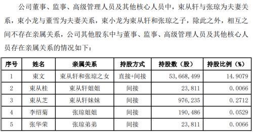 而公司股东束小龙先生直接持有公司8,931.02万股股份,束文女士直接持有公司1,786.21万股,束小龙、束文合计直接持股数量占公司股本总额的29.77%。同时,束小龙、董雪、束文通过合肥羽壹、青岛束董合计持有公司61.55%的股权。束小龙、董雪系夫妻关系,束小龙与束文系兄妹关系,该三人合计持有发行人91.32%股份。公司董事长束从轩系束小龙、束文的父亲,公司副总经理张琼系束小龙、束文的母亲。束从轩、张琼未持有公司股权。束从轩、张琼、束小龙、董雪、束文5名家族成员为发行人的实际控制人。