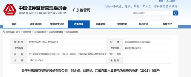 据证监会官网829日消息,广东监管局发布《关于对惠州亿纬锂能股份有限公司、刘金成、刘建华、江敏采取出具警示函措施的决定〔2023108号》。