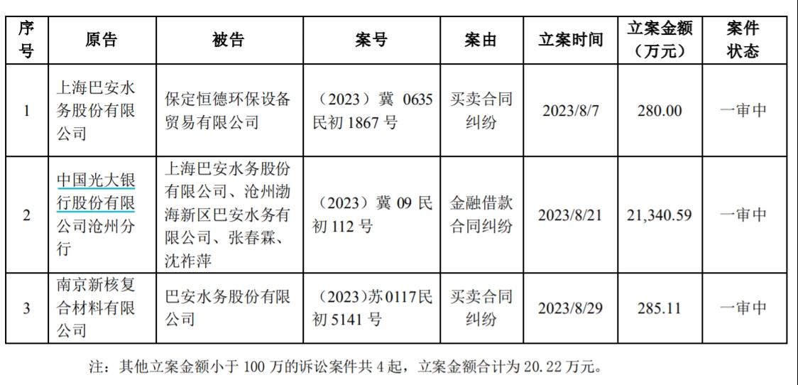 同日,巴安水务披露新增累计诉讼、仲裁事项的情况。公告称,除已经披露的诉讼、仲裁事项外,公司及子公司连续十二个月发生的新增累计诉讼、仲裁事项涉及金额合计约为人民币21925.93万元,占公司最近一期经审计净资产的 123.83%。