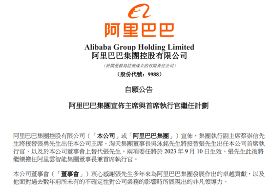 在今年7月的一封致股东的信中,张勇表示:“伴随着开启这一全新篇章,阿里巴巴控股集团也将在9月10日后迎来新的管理层:蔡崇信将接替我成为阿里巴巴控股集团董事会主席,吴泳铭将接替我成为阿里巴巴控股集团首席执行官。而我本人,也将奔赴全新的战场,专职做好阿里云智能集团董事长兼首席执行官的工作,去探索云计算、大数据、人工智能和千行百业融合创新的广阔未来。”