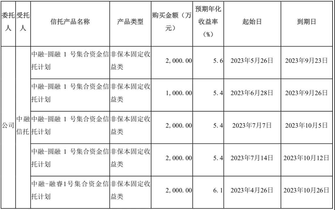 公告显示,光云科技分别于2023年5月26日、2023年6月28日、2023年7月7日、2023年7月14日、2023年4月26日购买了中融信托发行的信托产品圆融1号I 2000万元、圆融1号II 1000万元、圆融1号III 2000万元、圆融1号IV 2000万元、融睿1号2000万元,均为非保本固定收益类产品。
