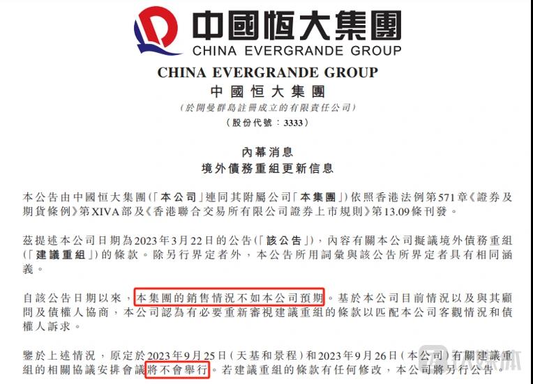 此前,恒大债务重组表决会议一推再推,直到9月22日直接发布公告称,由于销售情况不如预期,债务重组会议将不会举行。