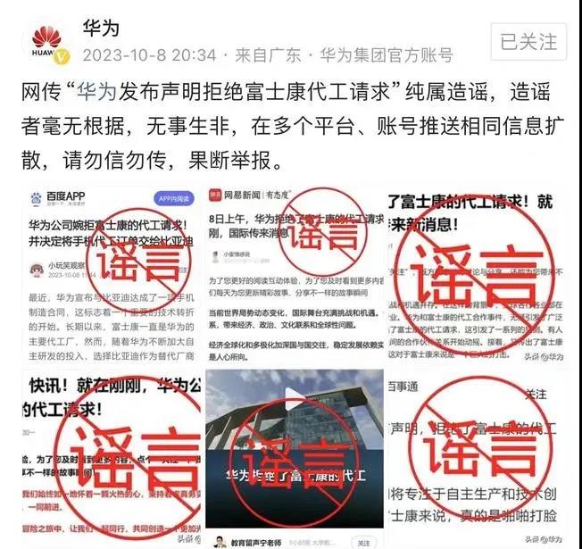 华为集团官方账号10月8日晚发布辟谣声明。声明中称:网传“华为发布声明拒绝富士康代工请求”纯属造谣,造谣者毫无根据,无事生非,在多个平台、账号推送相同信息扩散,请勿信勿传,果断举报。