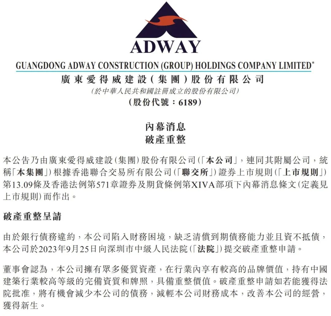 在全国房地产行业面临压力之际,广东爱得威建设(集团)股份有限公司也受到了影响。发布公告称,由于银行债务违约,公司陷入财务困境,缺乏清偿到期债务能力并且资不抵债,公司于2023年9月25日向深圳市中级人民法院提交破产重整申请。