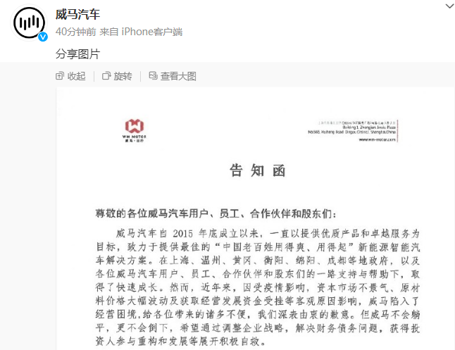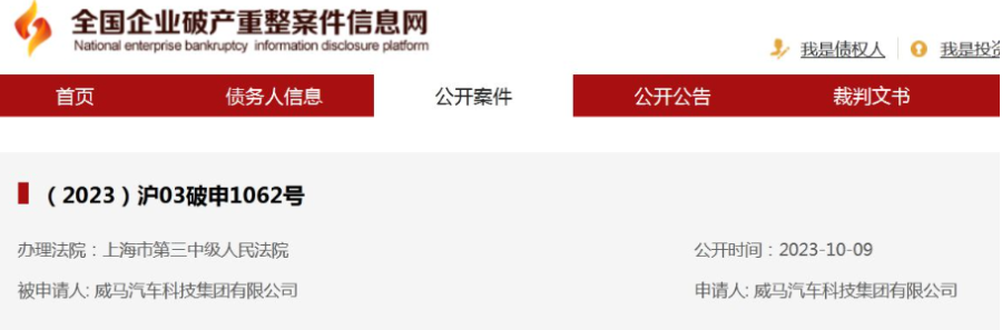 10月10日下午,威马汽车通过其官方微博发布告知函称,鉴于威马公司仍具有商业价值和挽救价值,公司治理结构尚完备,具有基本自主谈判能力,部分债权人也有重整意愿,上海市第三中级人民法院于2023年10月7日受理了威马汽车科技集团的预重整申请。