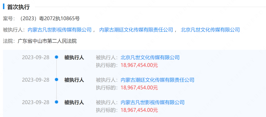 值得注意的是,公开信息显示,近日,吴亦凡关联公司北京凡世文化传媒有限公司、内蒙古潮廷文化传媒有限责任公司、内蒙古凡世影视传媒有限公司新增一则被执行人信息,执行标的1896万余元,执行法院为中山市第二人民法院,关联案件为华帝股份有限公司与上述公司相关服务合同纠纷。