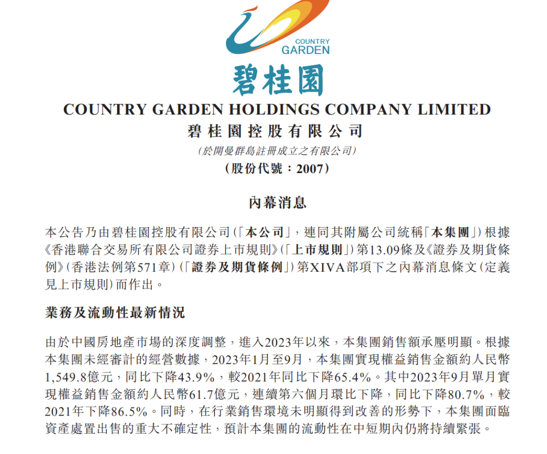 根据该公司未经审计的经营数据,2023年1月至9月,碧桂园实现权益销售金额约人民币 1549.8亿元,同比下降43.9%,较2021年同比下降65.4%。其中2023年9月单月实现权益销售金额约61.7亿元,连续第六个月环比下降,同比下降80.7%,较 2021年下降86.5%。碧桂园认为,在行业销售环境未明显得到改善的形势下,面临资产处置出售的重大不确定性,预计该公司的流动性在中短期内仍将持续紧张。