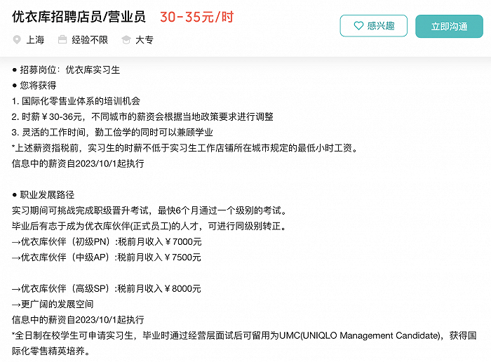 BOSS直聘上一则优衣库上海门店实习生招聘信息显示,实习生时薪为30-36元,若转为正式员工,初级(PN)、中级(AP)、高级(SP)员工税前月收入分别为7000元、7500元和8000元,以上薪资均从10月1日起执行。