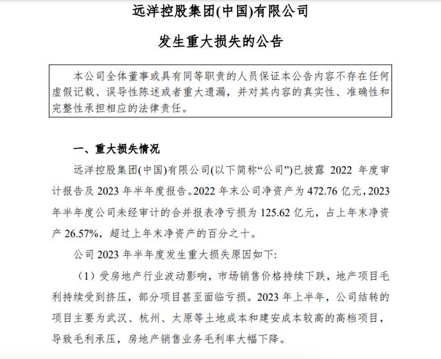 日前,远洋控股集团(中国)有限公司(下称“远洋控股集团”)披露了2022年度审计报告及2023年半年度报告。公告提到,2023年半年度公司发生重大损失。