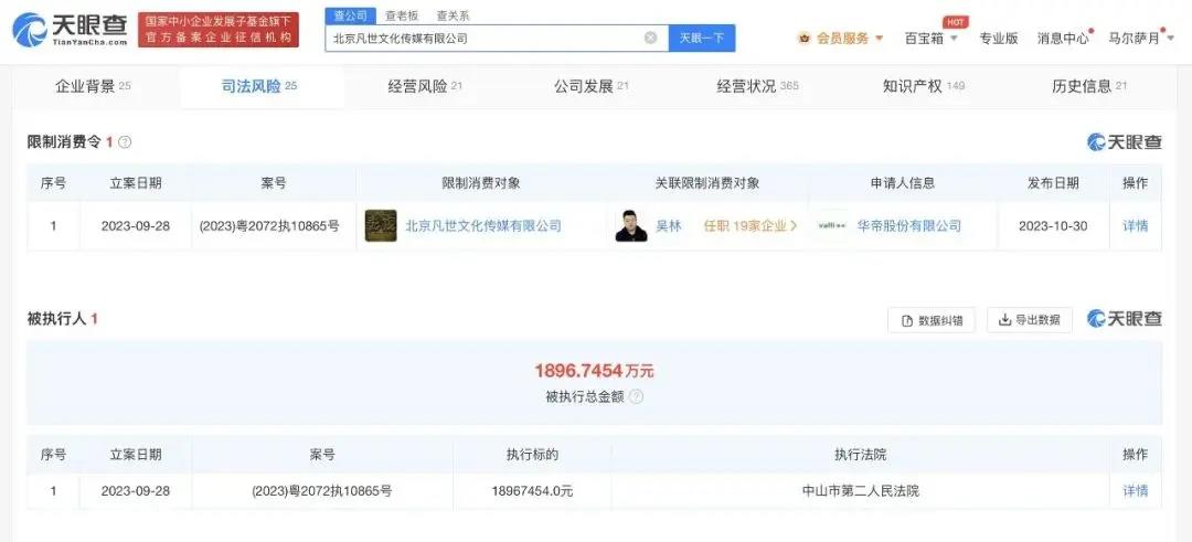 案件流程信息显示,2023年9月底,凡世传媒等相关方因服务合同纠纷诉讼,新增一则被执行人信息,执行标的1896万余元,执行法院为中山市第二人民法院。
