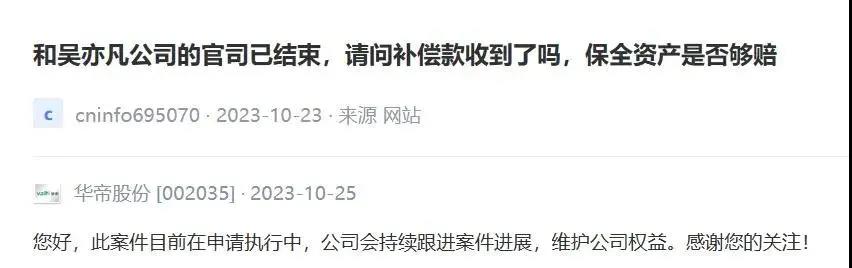 其中,10月25日,华帝股份在互动平台称:“此案件目前在申请执行中,公司会持续跟进案件进展,维护公司权益?!?/span>