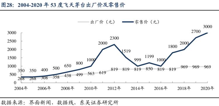 茅台上一次出厂价上调还要追溯到2017年底,彼时公告宣布从2018年1月1日起将茅台出厂价从819元提到969元,市场指导价为1499元/瓶,2900-3000元左右的终端零售价。