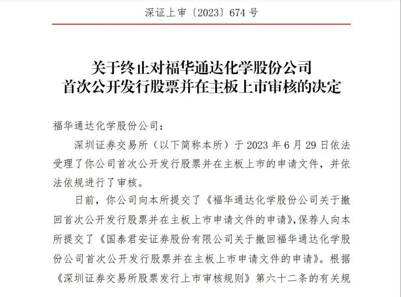 深交所发行上市审核信息公开网站显示,日前,?;Ш捅<龌瓜蛏罱凰峤涣松昵氤坊胤⑿猩鲜械奈募8荨渡钲谥と灰姿善狈⑿猩鲜猩蠛斯嬖颉返诹?,交易所决定终止对福华化学的首次公开发行股票并在主板上市的审核。