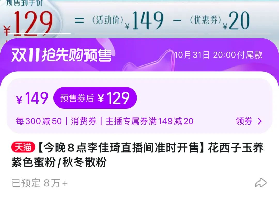 截至24日晚23时30分,花西子售价129元的蜜粉预定已超8万单,149元的粉饼预定超3万单,357元的组合套装预定超3000单,合计超过11万单。
