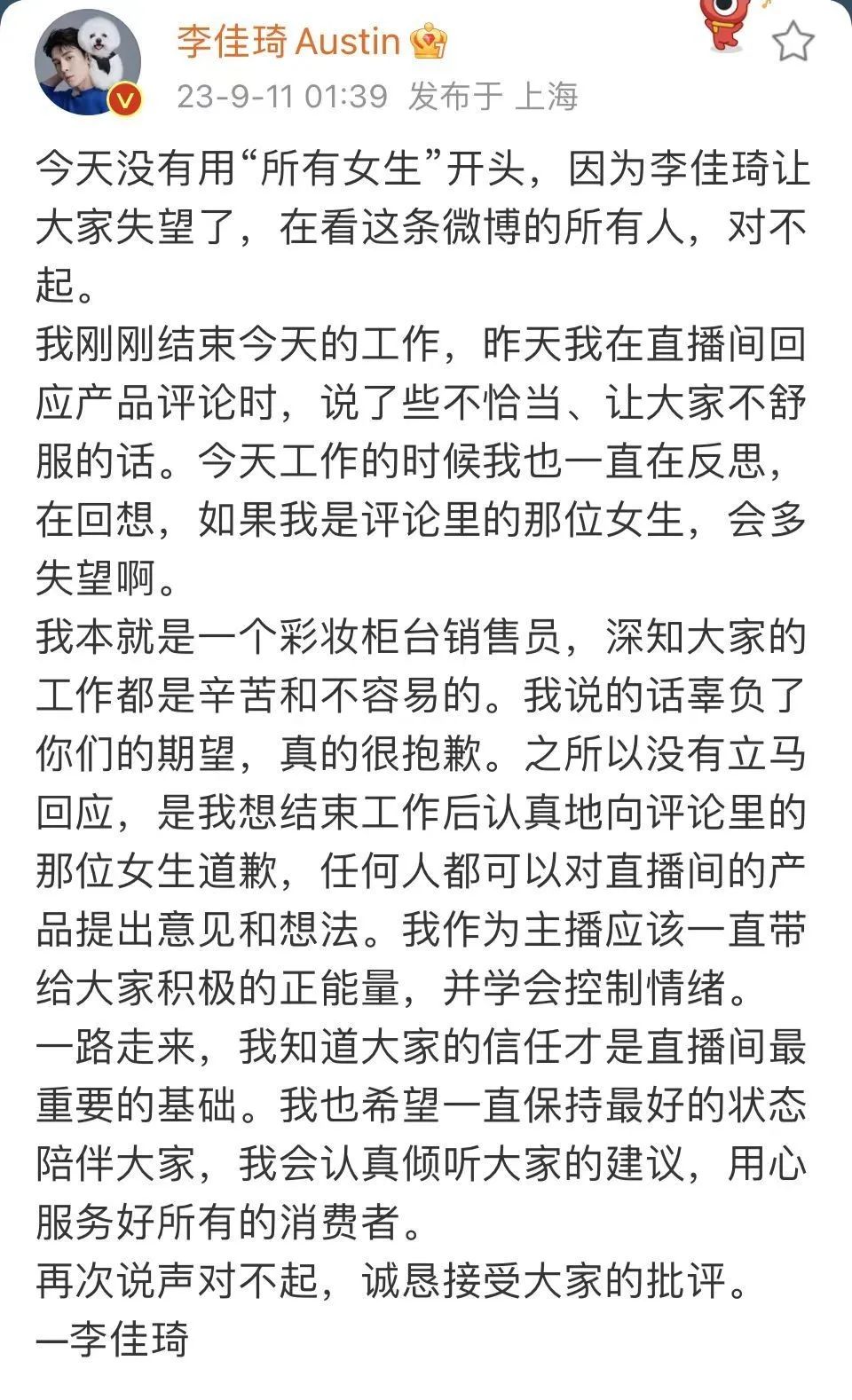 9月11日凌晨,李佳琦发布博文道歉,同日晚间发布道歉视频,称自己言论不当让大家失望,也会反思最初为什么要出发,怎样做能服务好更多女生,再次感谢大家对他的批评和监督。