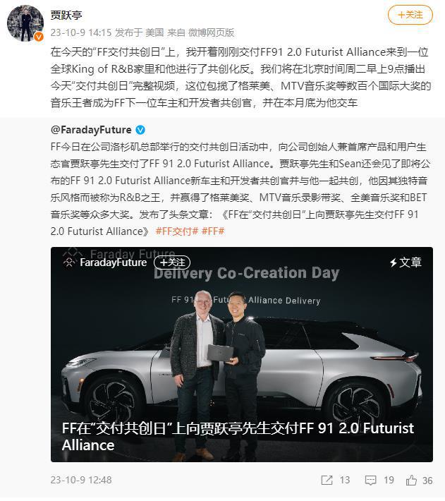 有意思的是,10月9日,FF向公司创始人兼首席产品和用户生态官贾跃亭交付了FF 91 2.0 Futurist Alliance。交付仪式上,贾跃亭称,除了资金之外,FF 已经基本具备了价值爆发的所有基础。目前,FF 正在全力引入机构投资者和战略投资者,解决生产爬坡所需要资金问题,提高供应链管理能力和成本控制能力,实现公司最低成本运营,同时快速提高产能和交付量。对于这一消息,有网友表示:“卖不出去了,只能先卖给自己”“交付给自己,这个主意谁想的”。