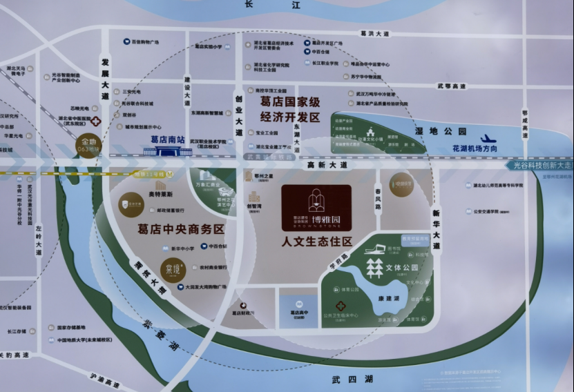 早在2019年,金地集团重仓布局光谷东,连拿四块地进入葛店,打造约80万方光谷东中央生活区,包含003,026,038,063等四个地块。