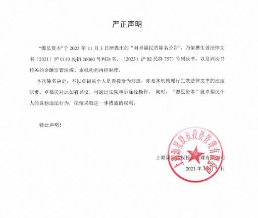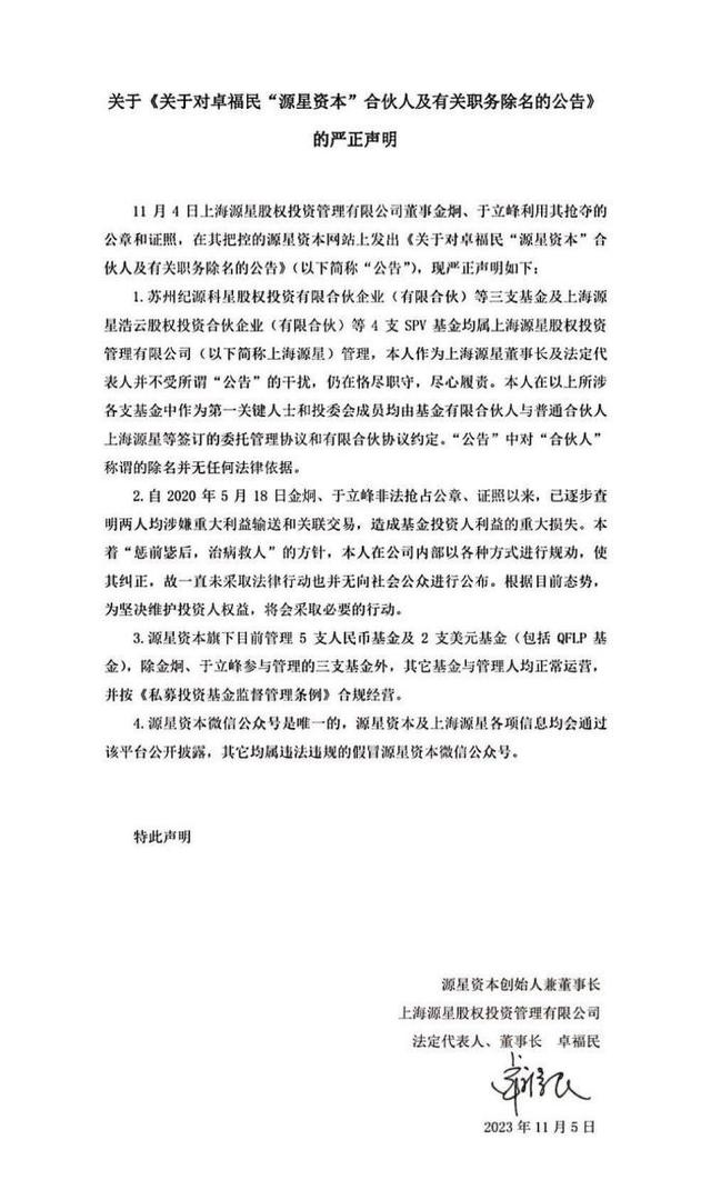 11月5日,卓福民在“源星资本”的微信公众号上发布严正声明予以回应,该账号主体为上海源星股权投资管理有限公司。他表示,苏州纪源科星股权投资有限合伙企业(有限合伙)等基金均属上海源星股权投资管理有限公司(以下简称“上海源星”)管理,其本人作为上海源星董事长及法定代表人并不受所谓“公告”的干扰,且在以上所涉各只基金中,他作为第一关键人士和投委会成员均由基金有限合伙人与普通合伙人上海源星等签订的委托管理协议和有限合伙协议约定。上述官网发布的公告对“合伙人”称谓的除名并无任何法律依据。