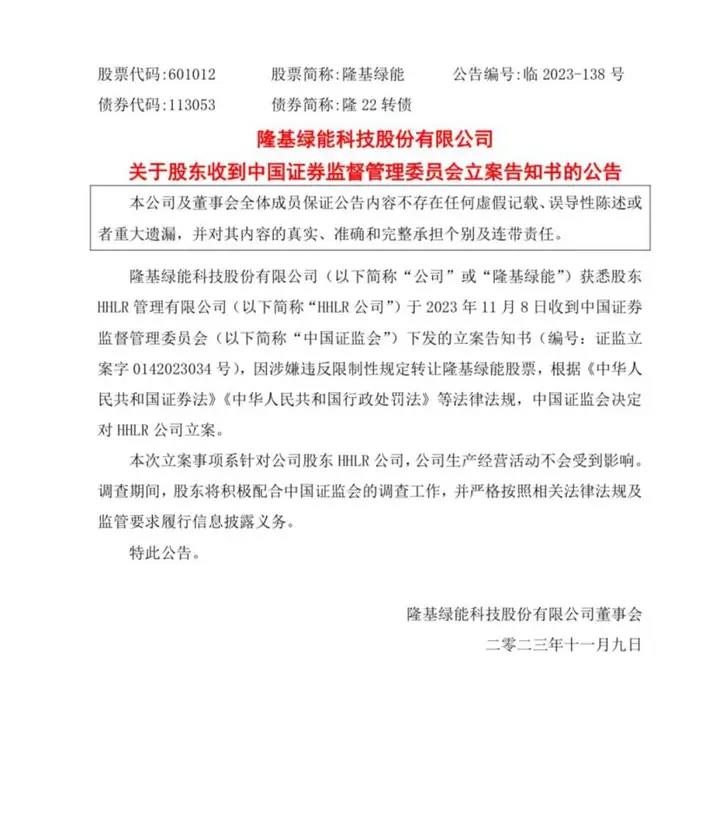 11月8日晚间消息,隆基绿能公告称,股东HHLR管理有限公司于当日收到中国证监会下发的立案告知书。因HHLR公司涉嫌违反限制性规定转让隆基绿能股票,中国证监会决定对HHLR公司立案。