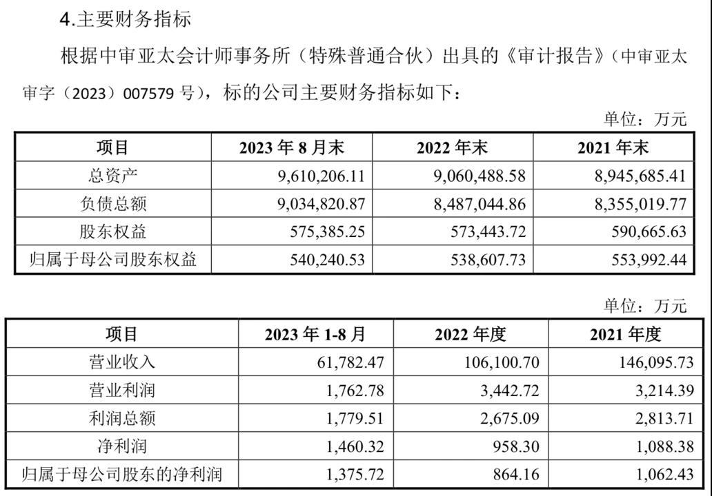 根据中审亚太会计师事务所(特殊普通合伙)出具的《审计报告》,自贡银行2023年8月末的总资产961.02亿元,负债总额为903.48亿元,股东权益57.54亿元,归属于母公司股东权益54.02亿元。2023年1-8月的营业收入为6.18亿元,净利润1375.72万元。