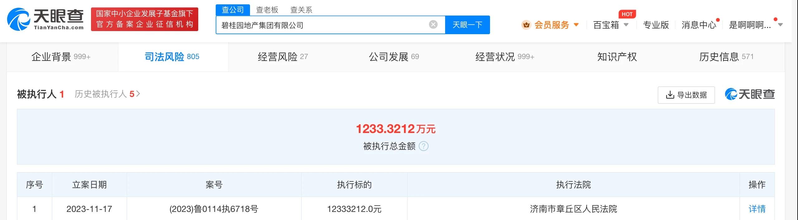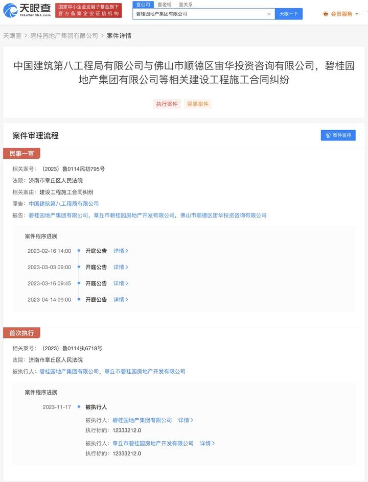天眼查App显示,近日,碧桂园地产集团有限公司及旗下章丘市碧桂园房地产开发有限公司新增一则被执行人信息,执行标的1233万余元,涉及建设工程施工合同纠纷案件,执行法院为济南市章丘区人民法院。碧桂园地产集团有限公司成立于2015年4月,法定代表人为简暖棠,注册资本约153亿人民币,由佛山市顺德区宙华投资咨询有限公司、深圳市碧桂科技发展有限公司分别持股91%、9%。
