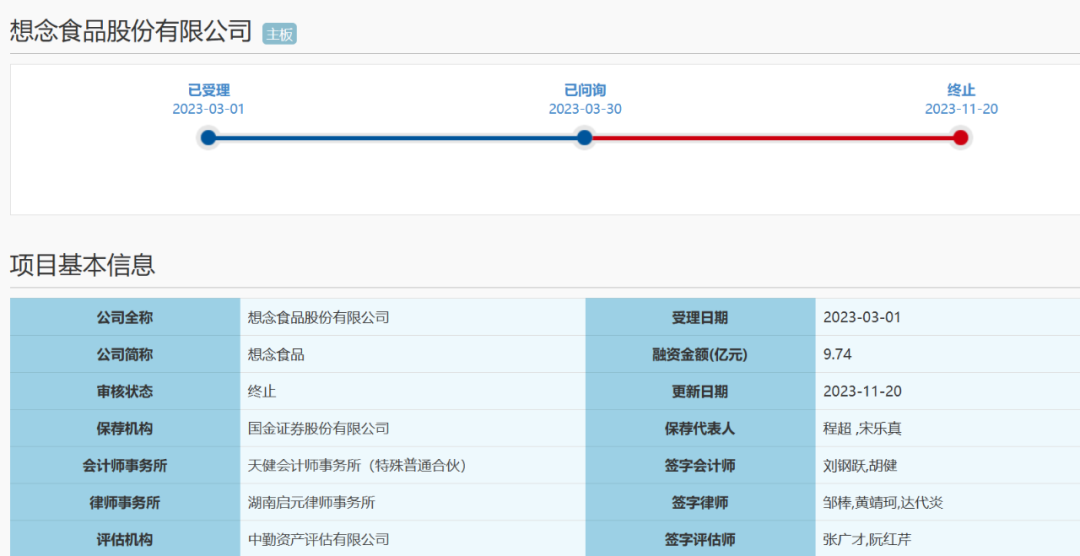 11月20日晚间,上交所官网显示,想念食品股份有限公司(以下简称“想念食品”)IPO处于终止状态。