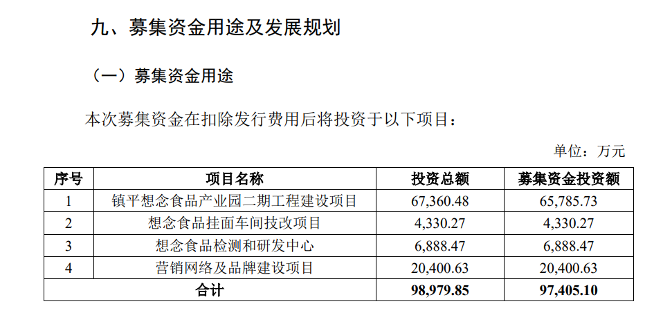 此次冲击沪市主板上市,想念食品原计划募资9.74亿元,分别投向镇平想念食品产业园二期工程建设项目、想念食品挂面车间技改项目、想念食品检测和研发中心 、营销网络及品牌建设项目。如今伴随着公司IPO撤单,想念食品上述募资愿景落空。