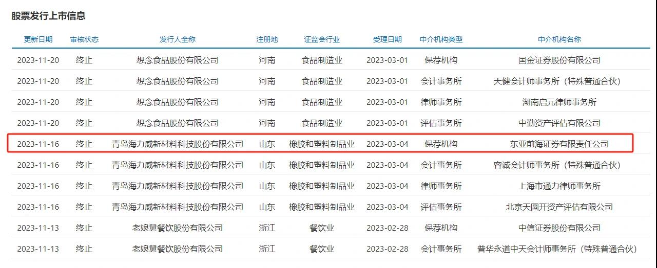 日前,上交所发布公告表示,终止对青岛海力威新材料科技股份有限公司(以下简称“海力威”)首次公开发行股票并在沪市主板上市的审核。据悉,此次终止上市实为海力威及其保荐机构前海证券主动撤回了上市申请。