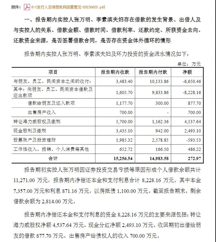 6月20日,海力威上交所询问进行了回复,回复意见表示,报告期内,实际控制人银行账户大额资金往来主要由实际控制人向其朋友、发行人员工及民间借贷机构的借款和还款产生,合计收款15,257万元,付款14,984万元。报告期初实际控制人存在较大的对外借款余额,主要系实际控制人借款进行证券交易产生较大金额的亏损,为偿还借款本息,实际控制人不断通过向其朋友、民间借贷机构及部分发行人员工借款。