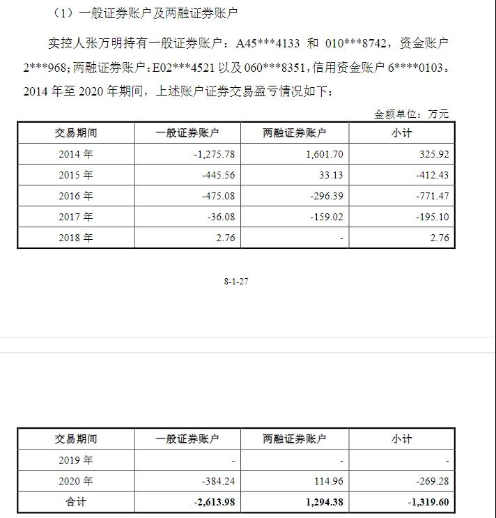 在2014年至2020年期间,实控人张万明的一般证券账户和两融证券账户累计亏损共计1,319.60万元。