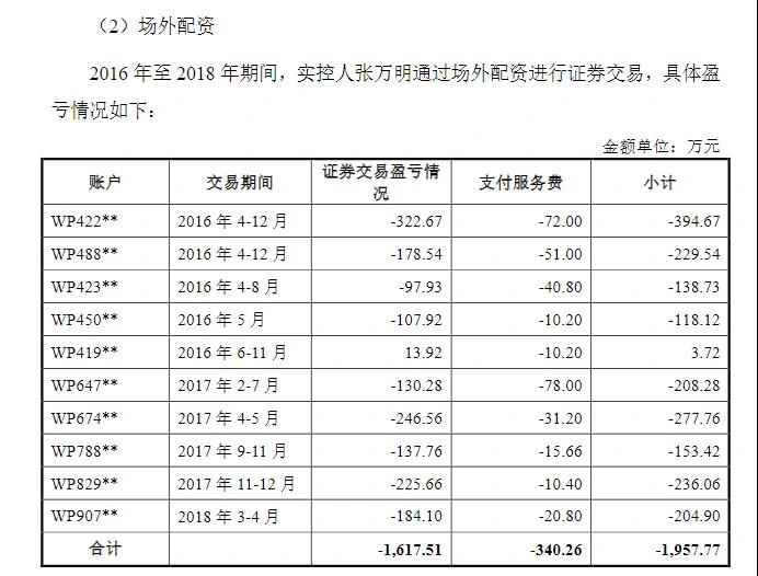 2016年至2018年期间,实控人张万明通过场外配资证券交易形成的亏损共计1,957.77万元,由证券交易亏损1,617.51万元和支付服务费用340.26万元构成。