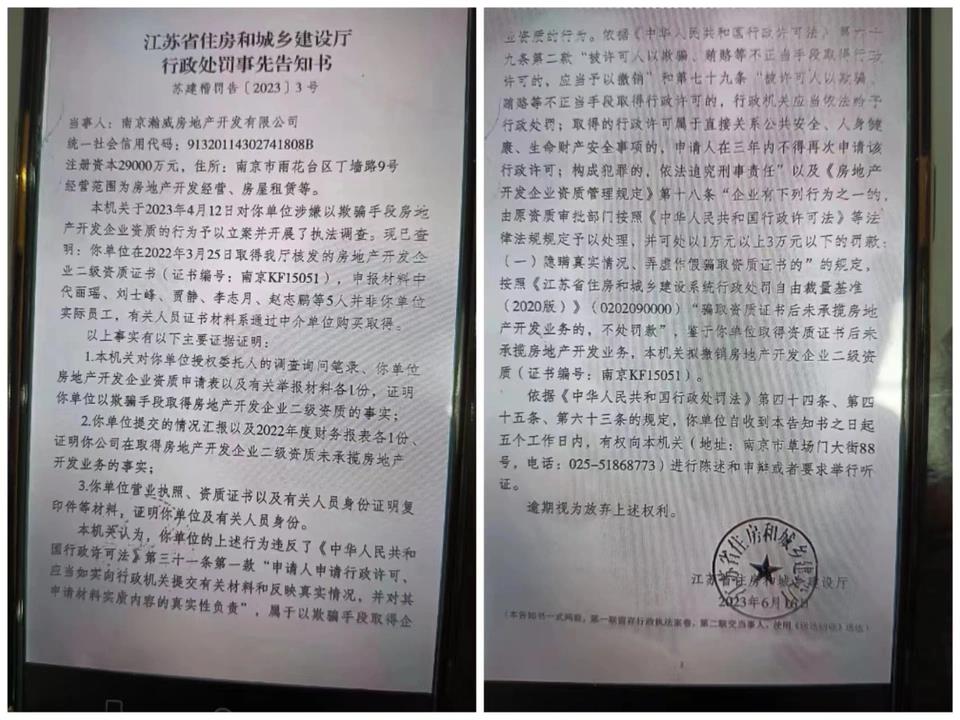 此外,钱先生告诉澎湃新闻,今年6月16日,江苏省住建厅对南京瀚威房地产开发有限公司下发了一份行政处罚事先告知书。据相关行政处罚事先告知书显示,南京瀚威房地产开发有限公司在2022年3月25日取得核发的房地产开发企业二级资质证书(证书编号:南京KF15051),其申报材料中有关人员的证书材料系通过中介单位购买取得。