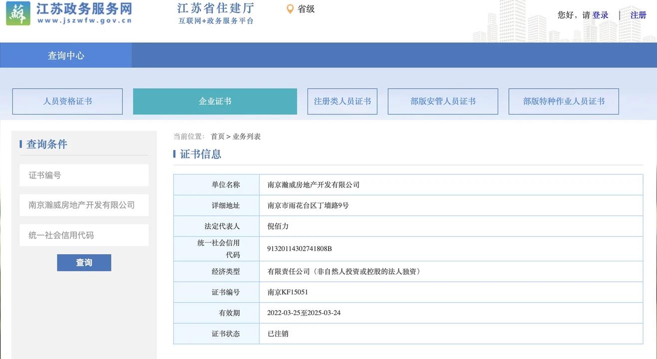 11月22日,澎湃新闻通过江苏省政务服务网站检索发现,南京瀚威房地产开发有限公司持有的房地产开发企业资质证书编号为“南京KF15051”,有效期为2022年3月25日至2025年3月24日,现已处于注销状态。