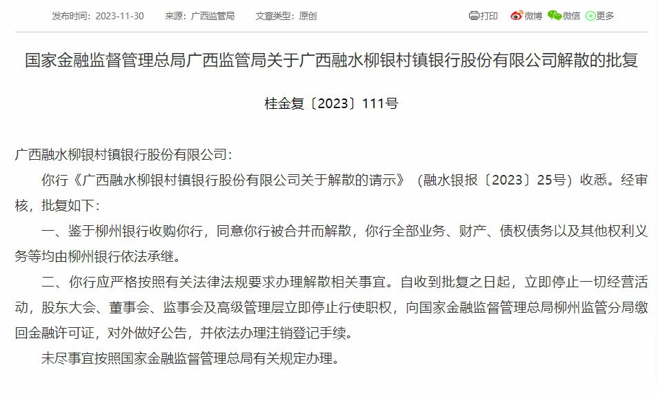 11月30日,国家金融监督管理总局发布公告,广西融水柳银村镇银行宣告解散。