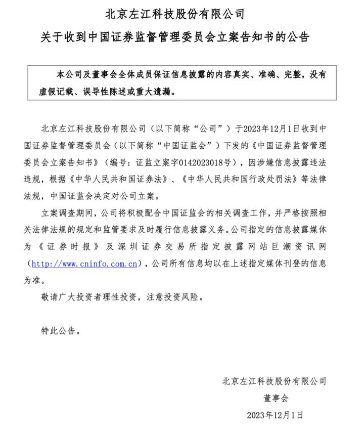 12月1日深夜,*ST左江发布公告称,公司于2023年12月1日收到证监会下发的《中国证券监督管理委员会立案告知书》,因涉嫌信息披露违法违规,证监会决定对公司立案。